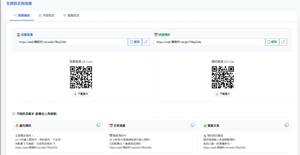 💡 小撇步: 建議在「內容設定」完成後,先去「推廣連結」點開網址查看預覽效果。若希望增加品牌識別度,可回到「店家設定 – 外觀風格」頁籤微調配色,確保整體視覺一致。