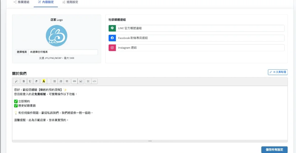 - 店家 Logo: 上傳品牌標誌(支援 JPG/PNG/WEBP,最大 5MB),此 Logo 將顯示於預約頁面最上方。