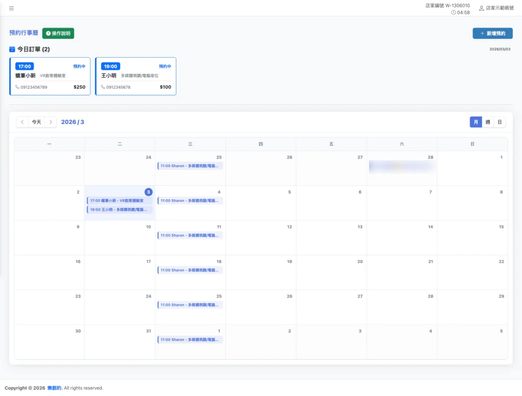 - 取消訂單: 若顧客未到或取消,請點擊紅色按鈕移除,釋出時段。