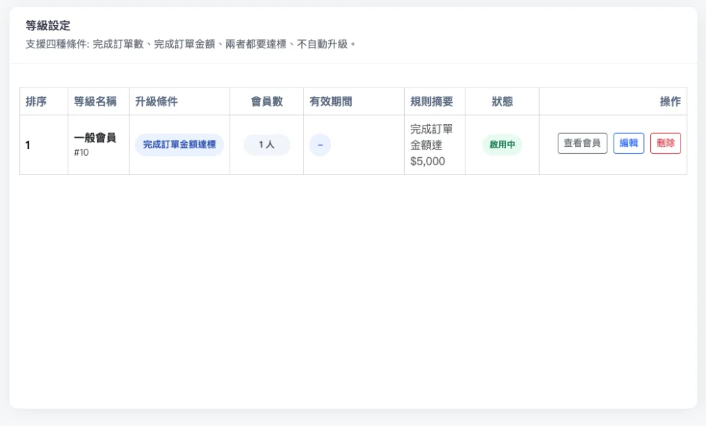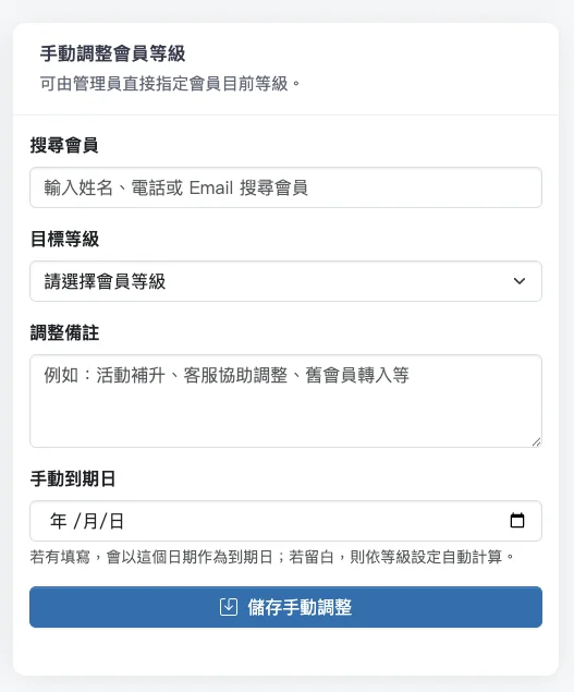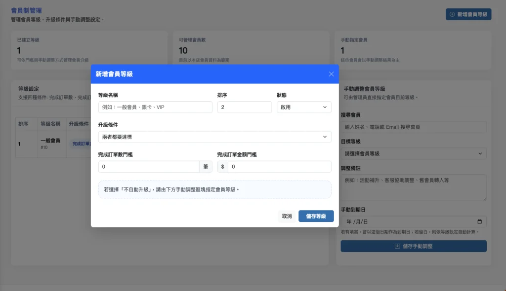 1.可手動調整會員等級,顧客即可在個人資料中查看自己的會員級別。