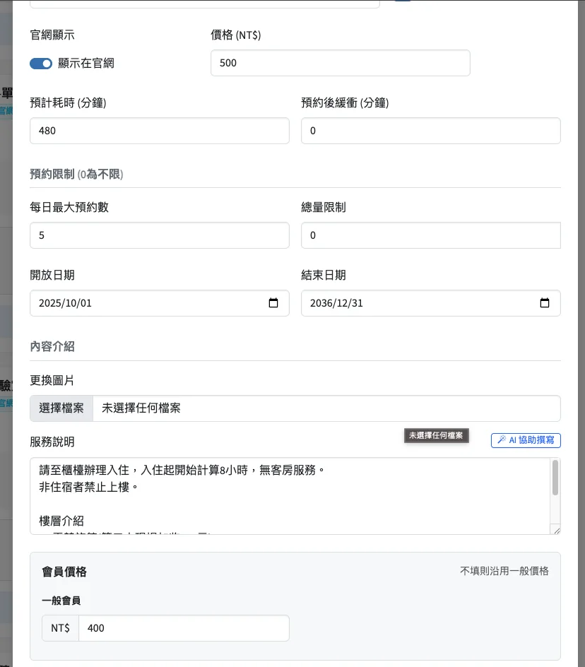 2.可設定會員價格、體驗價格,在服務項目設定中,可以針對各級別的會員顯示不同的價格!