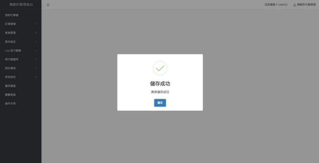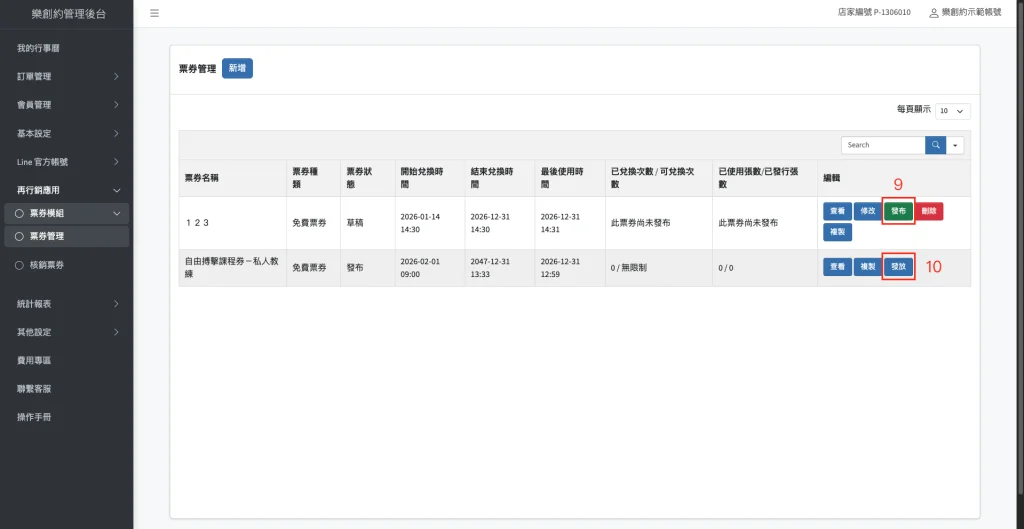 當票券完成設定並儲存後,必須「發布」票券,系統才會正式啟用該票券,供後續發放與使用。
