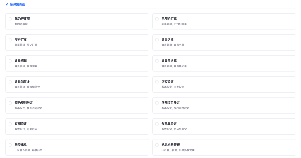 您可以直接勾選需要加鎖的後台頁面。